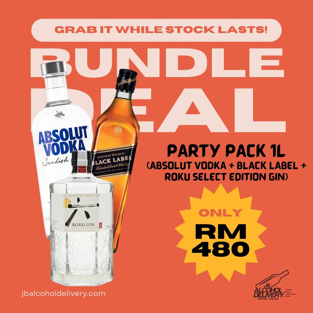 ✔ Includes: 3 x 1L Bottles (Absolut Vodka, Black Label, Roku Select Gin)